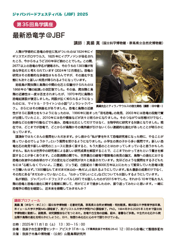 11/1(土)に第35回鳥学講座 最新恐竜学@JBFを開催します。