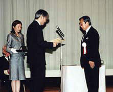 浅野理事長から表彰状を受け取られる佐藤氏。トキの保護に長年尽くされた佐藤氏、村本氏(右から1人目)、近辻氏(右から2人目)が表彰された。 |