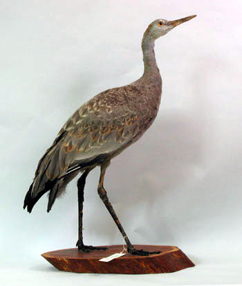 標本ラベルによれば、この個体は1978年10月に我が国の最北端である稚内市で見つかり、宗谷支庁から寄贈されたことになっています。当時日本でのカナダヅルの観察記録は非常に少なく、それ以前は1963年に鹿児島県出水平野で初めて確認されて以来、1973年と75年に出水平野で、1969年に北海道鶴居村でそれぞれ1羽が記録されているにすぎないのです。標本として残っている稚内産のこのカナダツルは、日本で5回目の記録であり、国内での第1号標本ということになります。今回、改めて関係者に追加取材を行ったところ、この個体は稚内市大字声問村字豊別で地元住民によって死体で発見され、地元の獣医さんによって剥製にされたことがわかりました。当初剥製は宗谷支庁に保管されていたのですが、学術的に貴重な資料なので地元に埋もれさせるべきではない、という北海道自然保護担当職員の方々の判断と努力で、山階鳥研に寄贈されたということです。