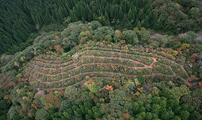 写真2 福井県の環境省織田1級鳥類観測ステーションの調査地空撮。尾根に沿ってカスミ網を張る小道が作られ、植生が管理されている。以前はカスミ網猟の鳥屋場(とやば)だった場所が、現在は科学研究のために役立てられている。